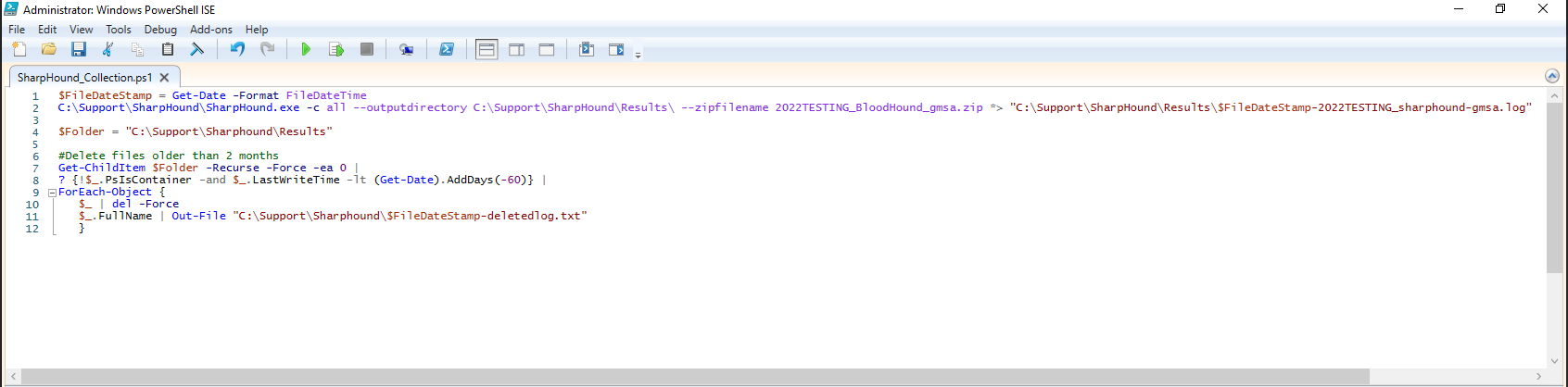 Sharphound_Collection.ps1to theC:\Support\Sharphounddirectory. - Modify the names of the base —zipfilename and the log file for each specific domain where this is deployed.