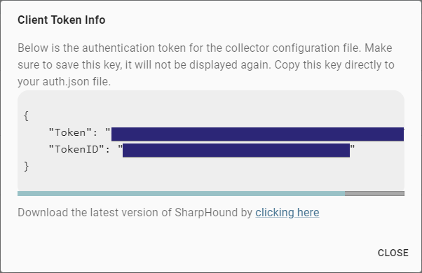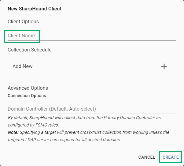 - In the pop-up window, for example named New SharpHound Enterprise Client, input the Client Name and click CREATE