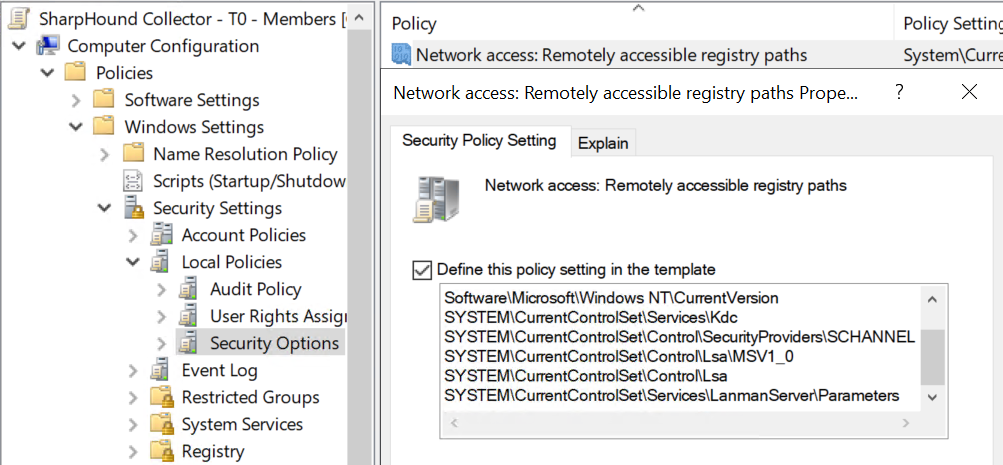Registry paths for NTLM relay edges exist on all Windows hosts. By default, onlyAdministrators can access these paths remotely. To enable least-privileged collection, use Group Policy to add these specific paths to AllowedExactPaths. This grants Authenticated Users remote read access, following the same method described above.
