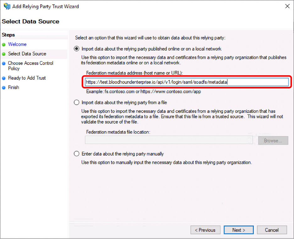 - Insert the metadata URL based on your chosen name and click “Next.”