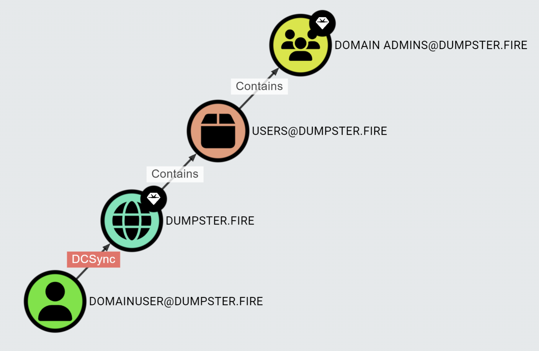 If you cannot abuse a given relationship between two nodes to take control of the end node, then the relationship is non-traversable. However, some non-traversable relationships can form a traversable relationship when combined. An example is the DCSync attack narrative. GetChanges and GetChangesAll permissions on the domain object combined enable you to perform the DCSync attack. GetChanges and GetChangesAll are non-traversable edges, and BloodHound uses them to produce the traversable DCSync edge in what we call the post-processing logic. Pathfinding includes only traversable edges. As a result, you might get a DCSync edge in a path like this:
